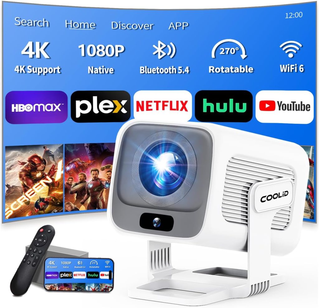 【WiFi 6 and Bi-directional Bluetooth 5.4】The Coolid projector features Bluetooth 5.4 and WiFi 6 dual-band technology (2.4GHz and 5GHz), making it easy to connect multiple devices with the latest upgrade. With bi-directional Bluetooth 5.4 audio transmission, you can connect Bluetooth headphones or speakers to use it as a stereo in standby mode and with built-in 360° surround sound for a cinema-quality audio experience. Enjoy seamless entertainment with ease.